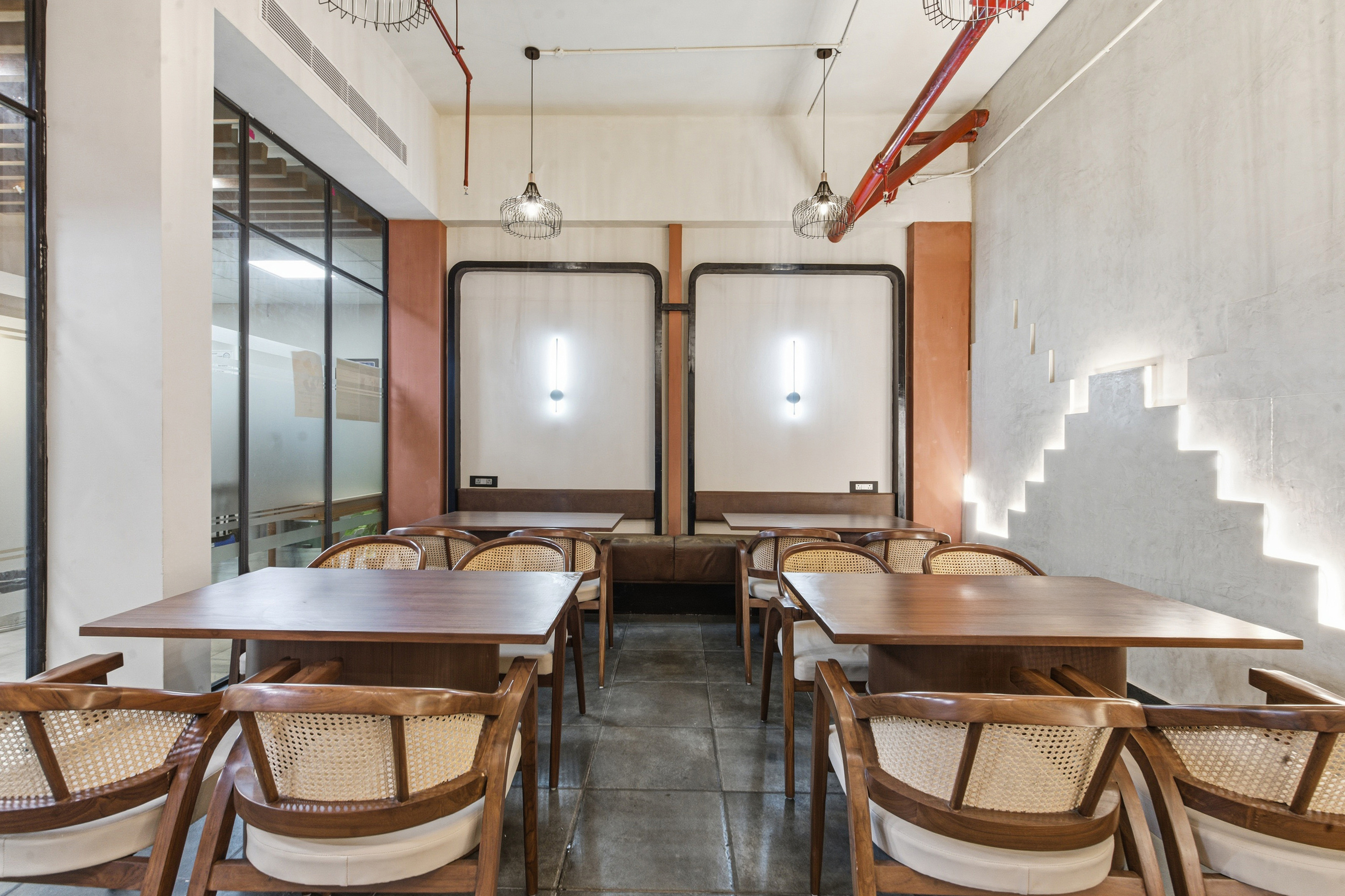 Muted grey surfaces form the base of the interior, complemented by warm wood tones and cane detailing in the furniture. The combination creates a balanced contrast—professional yet inviting.A stepped wall lighting feature was integrated to add depth and soft illumination, becoming the defining architectural element within the lounge.